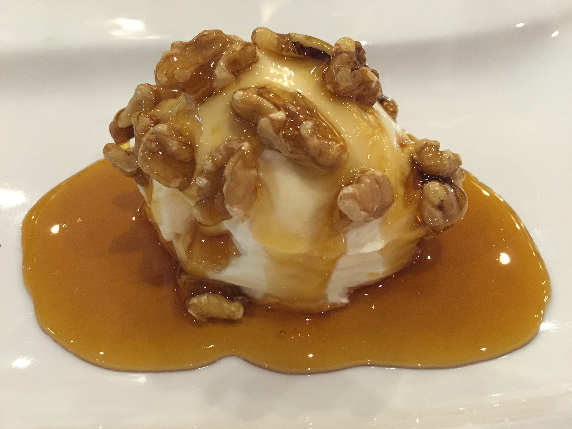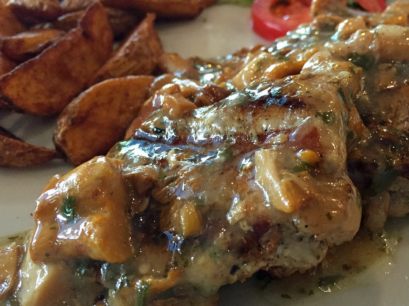 104 Lammrücken gegrillt in Metaxasauce, mit Bauernkartoffeln und gemischten Salat