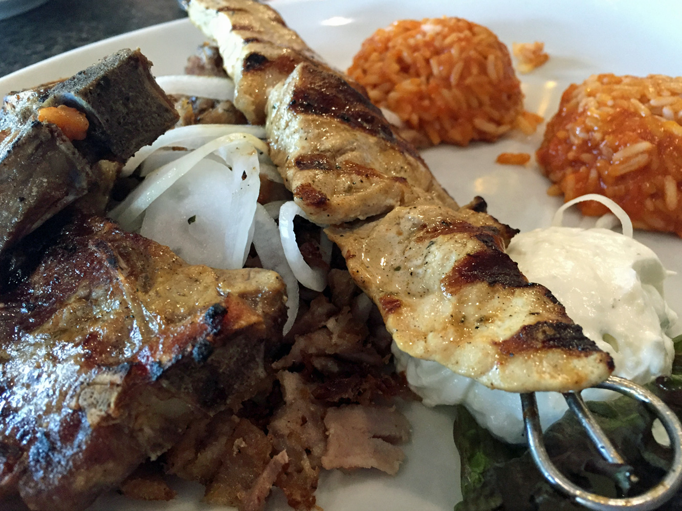 Giros vom Drehspieß, 1 Suvlaki, 2 Lammkoteletts dazu Tomatenreis, Zaziki und gemischter Salat